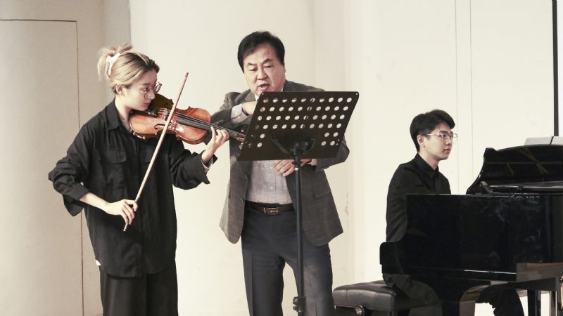 在大师班授课中,秋溪艺术大学副校长全星海教授和教师尹栋焕教授对我院小提琴专业学生的演奏给予了指导。全星海肯定了学生扎实的演奏基础和专业技能,以细致深入的讲解加深了学生对演奏技术的认识与理解;尹栋焕教授针对每位学生的特点因材施教,帮助学生解决演奏技术中出现的问题,提升音乐理解力。