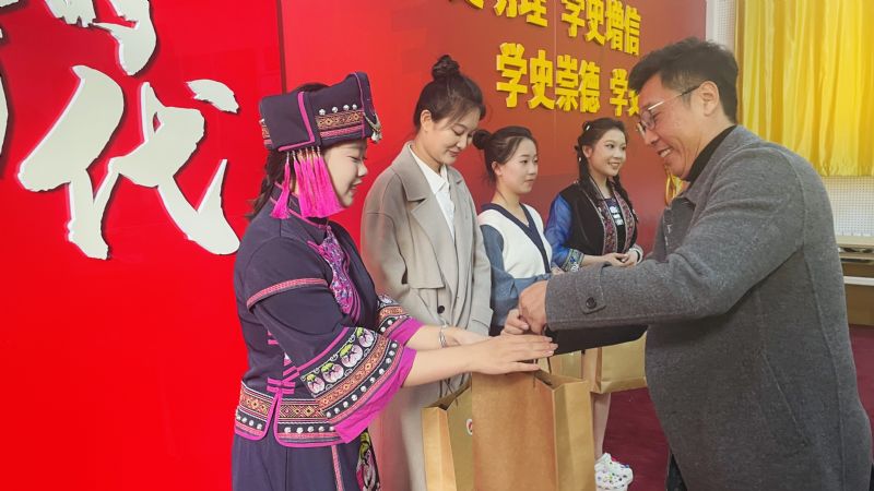 庞渤为少数民族新生代表发放理论学习书籍和生活用品
