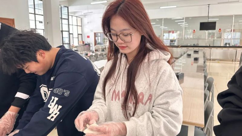 活动现场,食堂大师傅耐心地向同学们讲解和展示包饺子的手法。同学们也摩拳擦掌、跃跃欲试,准备大显身手。他们擀皮、添馅、对折、捏合…一整套干净利落的动作仿佛同学们平日在琴键上跳跃飞舞的指法。欢声笑语中,大家开启了花式包饺子模式。有的饺子像麦穗,有的像元宝,有的像小笼包……学院领导、教师也加入了包饺子行列,与同学们一起享受手工DIY的乐趣。