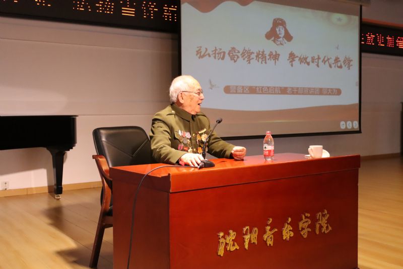3月5日,现代音乐学院党总支邀请著名词作家、志愿军老将军邬大为,为全体党员、团员及学生代表300余人讲授题为《继承优良传统,弘扬雷锋精神——让雷锋精神在新时代绽放更加璀璨的光芒》的春季学期“开学第一课”。