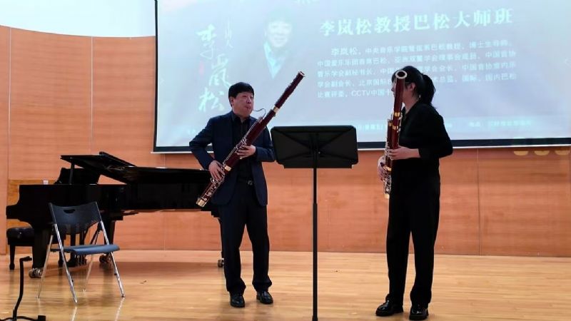 在为期两天的大师班上,李岚松对参与授课的管弦系和相关专业学生进行了耐心细致的讲解和指导。他的授课既细致严谨,又不失风趣幽默,极具亲和力,让师生们在轻松愉快的氛围中领略到巴松演奏艺术的无穷魅力。在授课过程中,李岚松指出,音乐作品是一种艺术呈现的过程,演奏者要将对乐曲深层次的理解化作演奏过程中的细微变化,通过既理性又充满激情的演绎,将作品完美地呈现给听众。他鼓励学生们在演奏中注重细节,用心去感受音乐中的每一个音符,让作品感动听众,还原作品的音乐本质。李岚松还指出,音乐作品中唯美的旋律与变换的节奏独具魅力,对陶冶人的情操发挥着不可替代的作用。他希望通过这次大师班活动,能够激发学生们怀着一份对音乐的热爱与追求,在艺术道路上不断前行、不断进步。