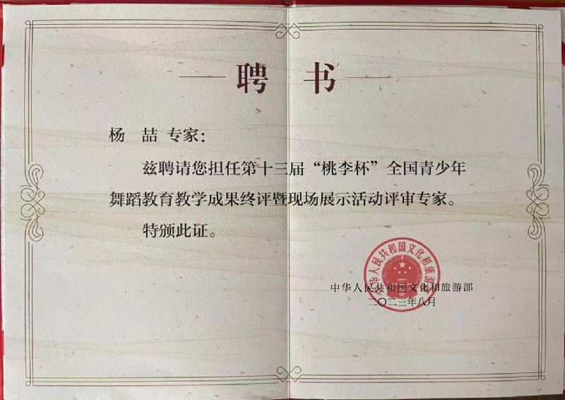 2023年,在由文化和旅游部主办,文化和旅游部科技教育司、北京舞蹈学院共同承办的第十三届“桃李杯”全国青少年舞蹈教育教学成果展示活动中,必威游戏中心戏剧影视学科研究中心智库负责人杨喆被中华人民共和国文化和旅游部聘为评审专家,顺利完成了6月复评和8月的终评工作。