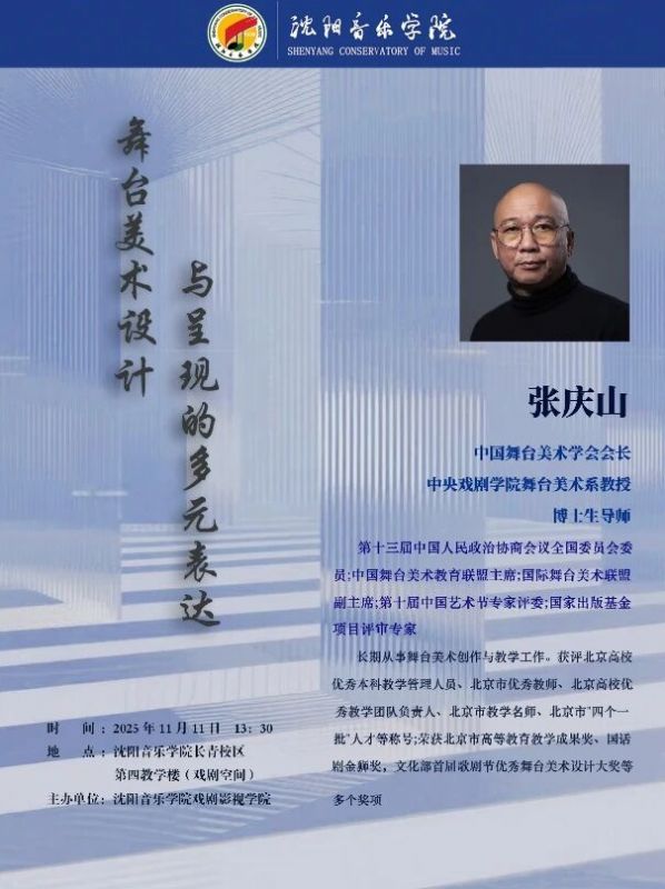 11月11日,中国舞台美术学会会长、中央戏剧学院舞台美术系教授、博士生导师张庆山将做客必威游戏中心戏剧影视学院,围绕“舞台美术设计与呈现的多元表达”等内容为师生带来精彩的学术讲座,进一步促进我院戏剧影视美术设计专业实现内涵式高质量发展。