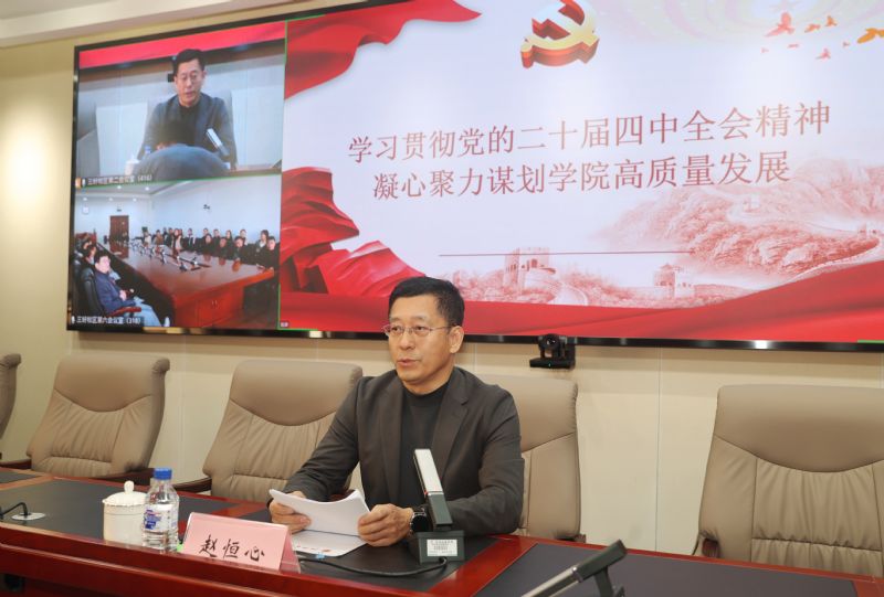 赵恒心强调,学习好、贯彻好党的二十届四中全会精神,是当前和今后一个时期全院上下的一项重大政治任务。全院各级党组织和全体党员干部要深刻认识全会的重大意义,切实提高政治站位,强化政治担当,精心组织、扎实推进,迅速掀起学习宣传贯彻全会精神的热潮,要准确把握全会提出的新思想、新观点、新论断、新要求,真正用党的创新理论武装头脑、指导实践、推动工作。要全方位、多角度、深层次宣传解读党的二十届四中全会精神,确保全会精神在学院内得到广泛传播和深入解读,切实将所学所悟转化为实际行动,为学院的高质量发展注入强大动力。要在深刻领会全会精神的基础上,把深入学习贯彻全会精神同推动学院改革发展实践结合起来,同解决学院改革发展稳定的重大问题结合起来,全面对标对表全会各项决策部署,进一步做好学院“十五五”规划编制工作,谋深谋实谋细各项任务,以规划定蓝图,以改革促发展,以实践求实效。