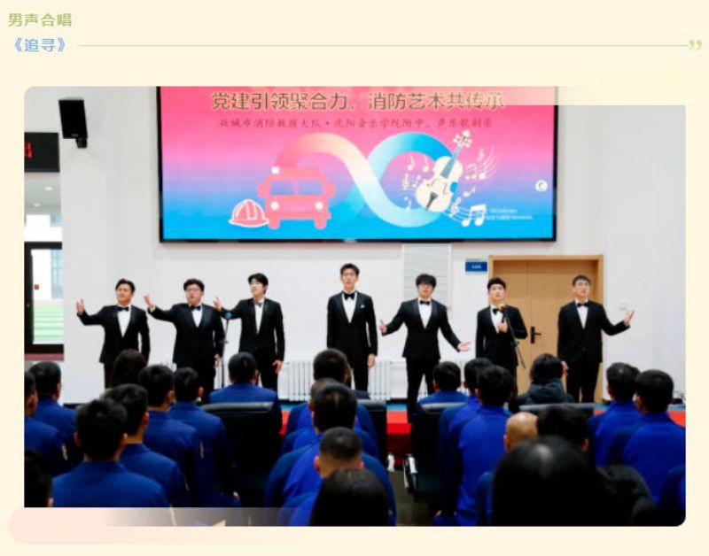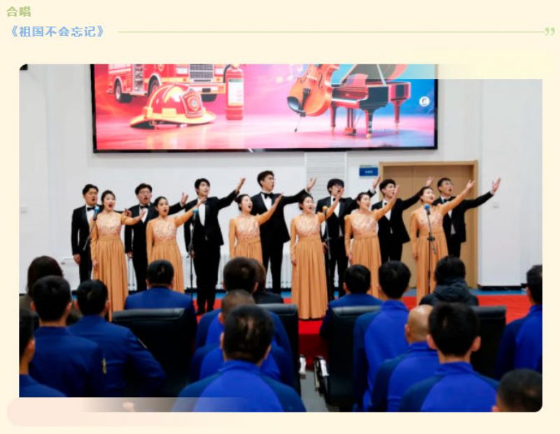 观摩结束后,轻骑兵队员们便迅速转换角色,消防员整齐就座,目光中写满期待。“拂去岁月厚厚的封尘,敞开心的世界记忆的闸门……”演出在轻骑兵小合唱《追寻》中拉开序幕,清亮的嗓音穿过训练馆,将深情与敬意揉进每一个音符;紧接着,《扬鞭催马运粮忙》《祖国不会忘记》等经典歌曲接连响起,队员们或用激昂的合唱点燃热血,或用深情的独唱诉说牵挂,演出尾声,全体队员与消防员合唱《我和我的祖国》,歌声穿透训练馆,将“军民一家亲”的温情推向高潮。嘹亮的红歌、动人的旋律传递着对消防英雄的敬意,为即将到来的“11·9”消防日献上sxaqs师生的温情与力量。