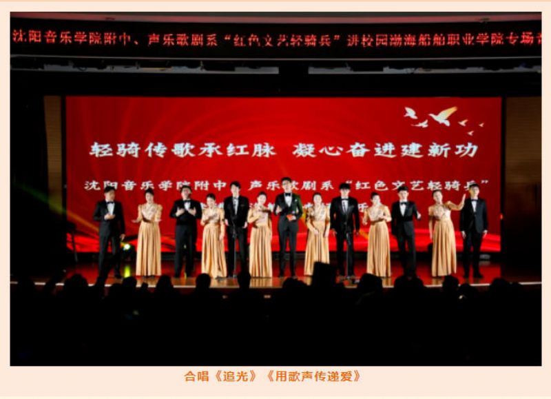 当晚,葫芦岛渤海船舶职业学院报告厅内暖意融融,两支红色文艺轻骑兵小分队为该院师生精心编排了一场多元演出,歌曲、器乐演奏等轮番登场。《用歌声传递爱》的激昂旋律、《快乐女战士》的轻快节奏接连响起,台下掌声与歌声交织共鸣,俨然化作一堂浸润心灵的“红色艺术课”。