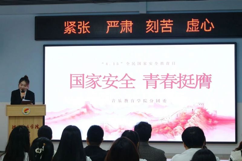 在第十个国家安全日来临之际,为深入学习贯彻总体国家安全观,增强青年学生的文化安全意识与自我保护能力,音乐教育学院民族器乐教育系于4月15日在长青校区第二教学楼103室举办“国家安全 青春挺膺”国家安全教育主题团日活动。音乐教育学院学生管理科科长赵晓晨、分团委书记李静霞、民族器乐教育系党支部书记吴琼、辅导员及学生代表60余人参加活动。