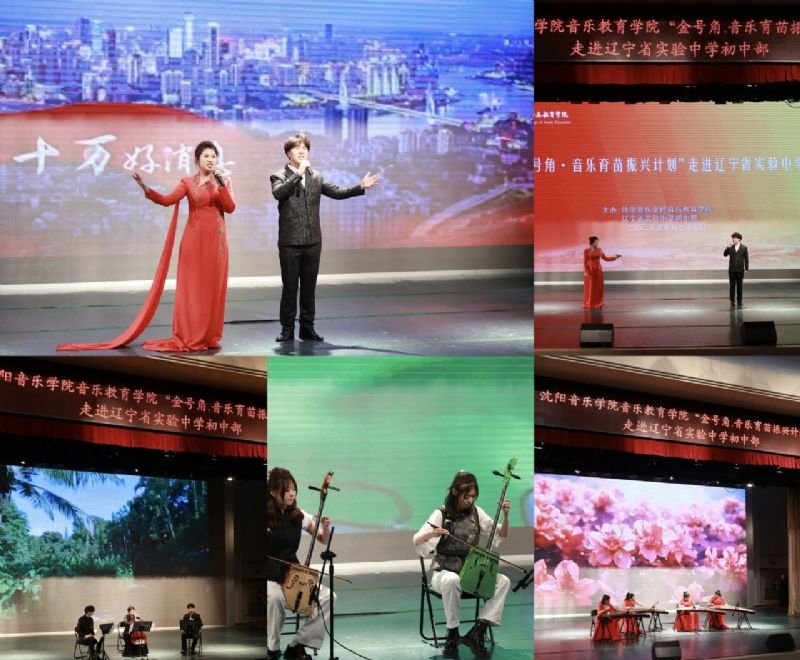 “金号角”文艺宣讲团在辽宁省实验中学艺术中心开展文艺演出。辽宁省实验中学党委委员、副校长、分管初中部校长于长禄与初三年级、初一年级全体教师及学生共同观看演出。古筝四重奏《山丹丹开花红艳艳》拉开了文艺演出序幕;男声独唱《红星照我去战斗》《倔强》、女声独唱《灯火里的中国》在满怀深情、嘹亮高亢的歌声中让大家感受到“党的教导记心头”的滚烫誓言;器乐三重奏《Where did all the birds go》和小提琴独奏《我爱你中国》展现了西洋管弦乐器流淌的优美旋律和爱国情怀;竹笛独奏《扬鞭催马运粮忙》、唢呐独奏《胜利秧歌》、马头琴二重奏《万马奔腾》展现了中国民族器乐之声散发的文化自信;男女声二重唱《春风十万里》和男女声四重唱《领航》用交相辉映的旋律交错唱响中国时代之声;全体大合唱《相亲相爱》将演出推向高潮。活动现场,师生掌声雷动,热情高涨。