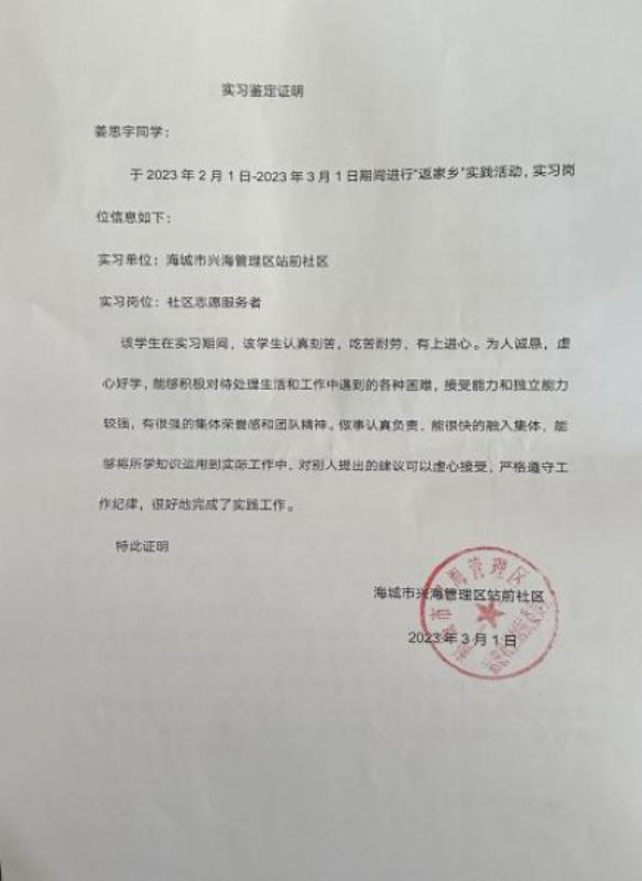 实践经历:完成社区宣传禁放禁燃烟花爆竹行动、发放禁燃宣传手册、清理社区卫生、协助整理社区居民资料等。