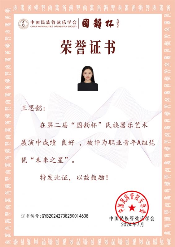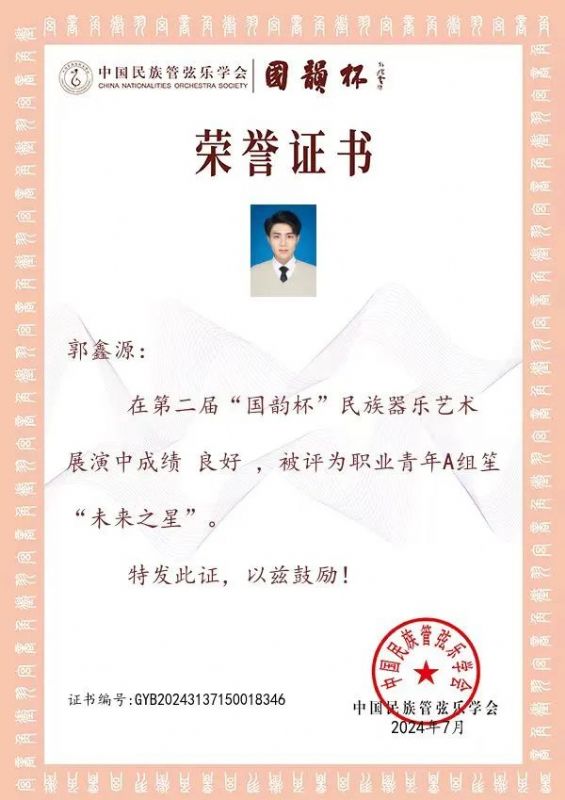 第二届“国韵杯”民族器乐艺术展演,是中国民族管弦乐学会精心打造的全国性艺术展演展示交流活动。本次展演活动的职业组青年A组、职业组合组参演选手众多,所涉及职业演出团体、音乐专业院校的在校注册学生、青年教师、职业演奏员等。在师生们共同努力下,最终获得了一项“民乐之星”、五项“未来之星”、八项“希望之星”称号。在此,对展演活动中师生们取得的优异成绩表示祝贺!
