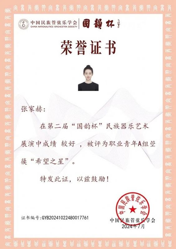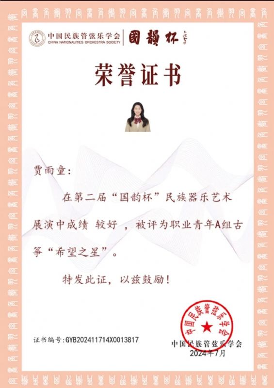 摘获“未来之星”职业组合奖两项,分别是:羽之韵筝乐团(2023级研究生顾嘉萱、2022级本科生李佳璐、2023级本科生乔新媛、周婧讴、任宸熠),指导教师贾晓莉教授;弘韵箜篌乐团(2022级研究生王锌睿、2020级本科生杨一凡、2021级本科生于靖涵、管笙越、2023级本科生林嫣),指导教师贺虹教授。