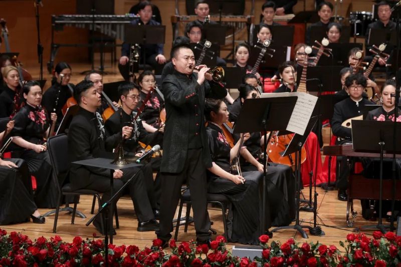 随后的男高音独唱《我的北方》,抒情的歌声将游子对北疆故土的眷恋娓娓道来,令观众为之深深动容。唢呐协奏曲《万里壮歌》则以苍劲悲怆的旋律再现长征壮举,演奏者以唢呐为“笔”,在管弦乐队的烘托下绘就英雄史诗。