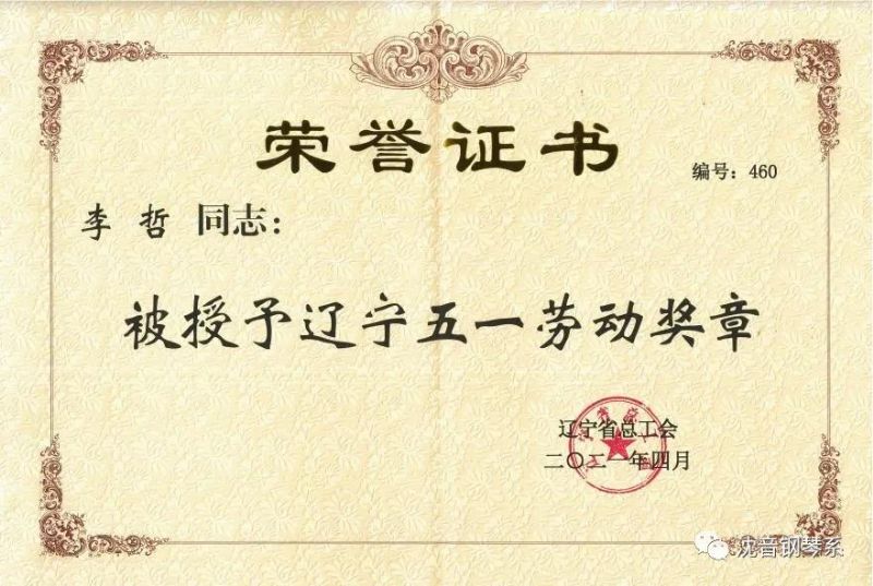 在2021年辽宁五一劳动奖章、辽宁工人先锋号评选活动中,钢琴系主任李哲同志荣获“辽宁五一劳动奖章”。
