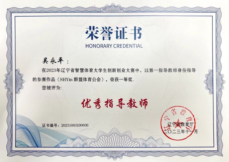 年辽宁省智慧体育大学生创新创业大赛中,吴永平、初晓卓联合指导的作品,荣获省级一等奖。