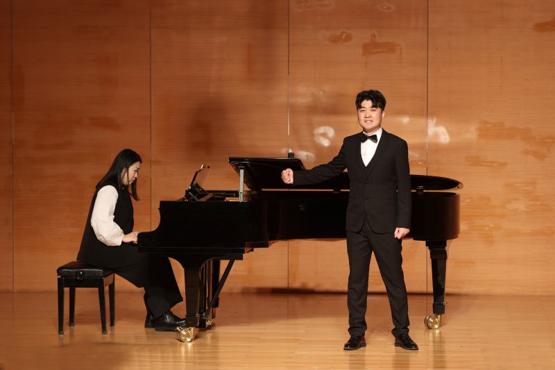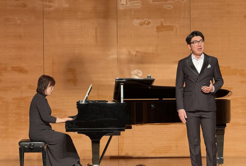 2022级研究生崔洪瑞演唱歌剧《沂蒙山》选段《爱永在》,将剧中人物林生对家乡和亲人的眷恋之情演绎得淋漓尽致。第二首多尼采蒂歌剧《军中女郎》中的选段“Ah mes amis”被誉为男高音的试金石,他精彩的演唱,赢得了现场观众的阵阵欢呼。