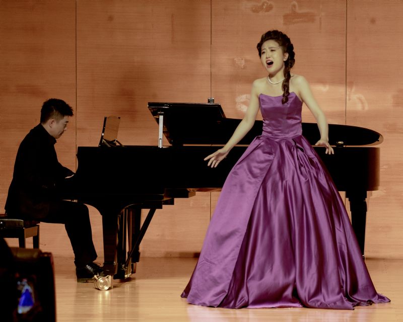 2023级研究生陈靓蕊演唱歌曲《黄河怨》,歌曲旋律深沉悲愤,她的歌声展现出中华儿女全民抗战的强烈爱国之情,另一首是威尔第歌剧《命运之力》选段“Pace, Pace, Mio Dio”,这首咏叹调充满了不安的情绪,她的嗓音清澈又富有感染力,表达了女主角莱奥诺拉对阿尔瓦罗的喜爱。