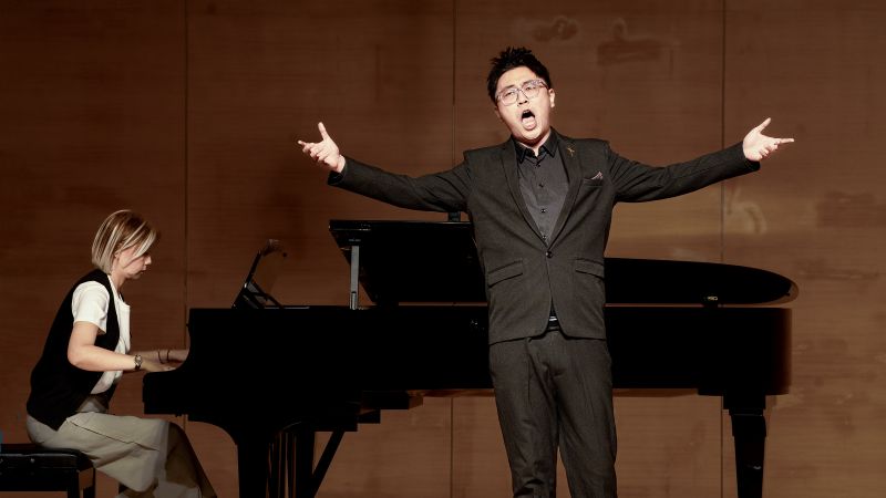 2024级研究生孙一盛演唱威尔第歌剧《化妆舞会》选段“Eri tu che macchiavi”,他的嗓音浑厚,描绘出雷纳多对友谊的失望和绝望,决心要让里卡多的鲜血来清洗他被玷污的灵魂。第二首《黑雾》是一首戏剧性较强的歌曲,他精彩演绎了复杂而细腻的情绪变化。