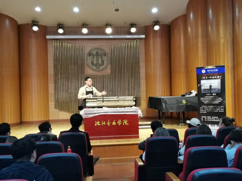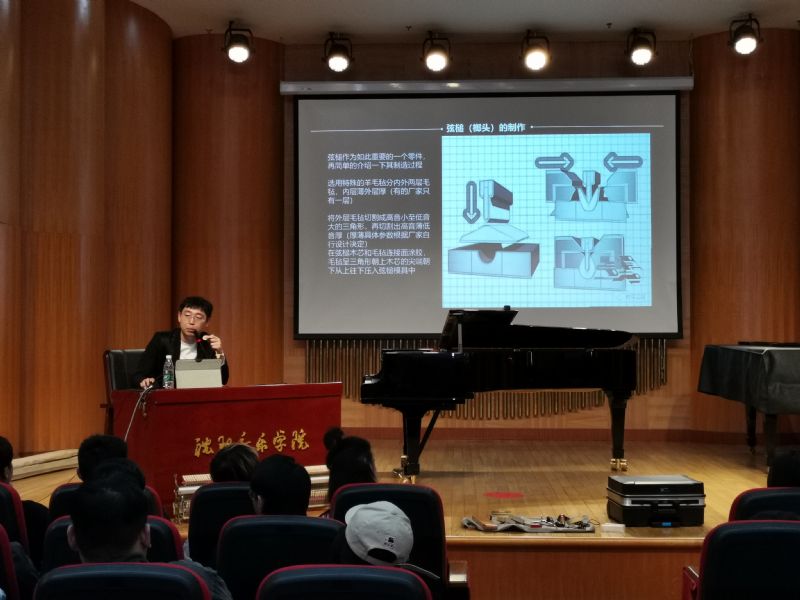 音乐科技系乐器修造教研室主任魏新宇做了专题讲座《整音——钢琴弦槌针刺原理》。主要介绍了钢琴弦槌的制作工艺及材料构成,然后讲解了用针刺的方法来达到改变音色的原理。