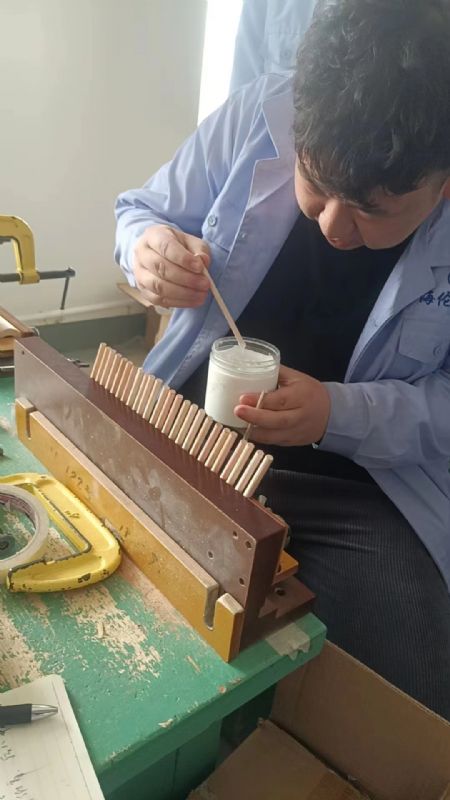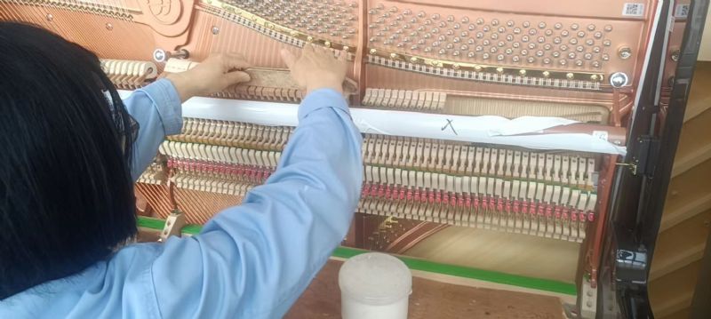 二翻是通过拧卡钉调整开门距离,调整钢琴键盘,包括键深、键高、键间距,对头番的工作进行精细调整。
