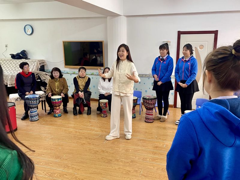 活动中,音乐科技系乐音与健康专业的师生积极发挥专业优势助力此次活动。在音乐疗愈室,乐音与健康教研室主任史美馥带领园内的老师们体验了节奏律动、即兴乐器合奏和鼓圈活动,让老师们在律动中释放压力,感受音乐对身心的深层疗愈,并体会不同技术对专注力、观察力、模仿能力、合作能力的培养。音乐科技系师生与启智幼儿园的老师们一起互动,现场气氛热烈且温馨。