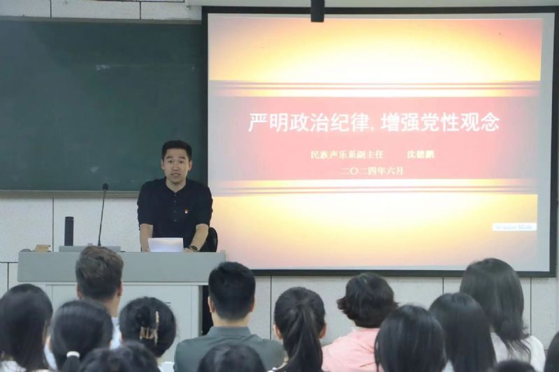 为深入学习贯彻习近平总书记关于党纪学习教育的重要讲话和重要指示批示精神,进一步推动党纪学习教育走深走实,把“六项纪律”内化于心、外化于行,推动党纪学习教育融入日常、抓在经常,让学纪、知纪、明纪、守纪在师生党员中蔚然成风,6月7日,民族声乐系党总支书记郎丽红作“深入学习贯彻《中国共产党纪律处分条例》,做学纪知纪明纪守纪的模范”专题党课,民族声乐系副主任沈德鹏作“严明政治纪律,增强党性观念”专题党课。民族声乐系师生党员、入党积极分子参加党课。