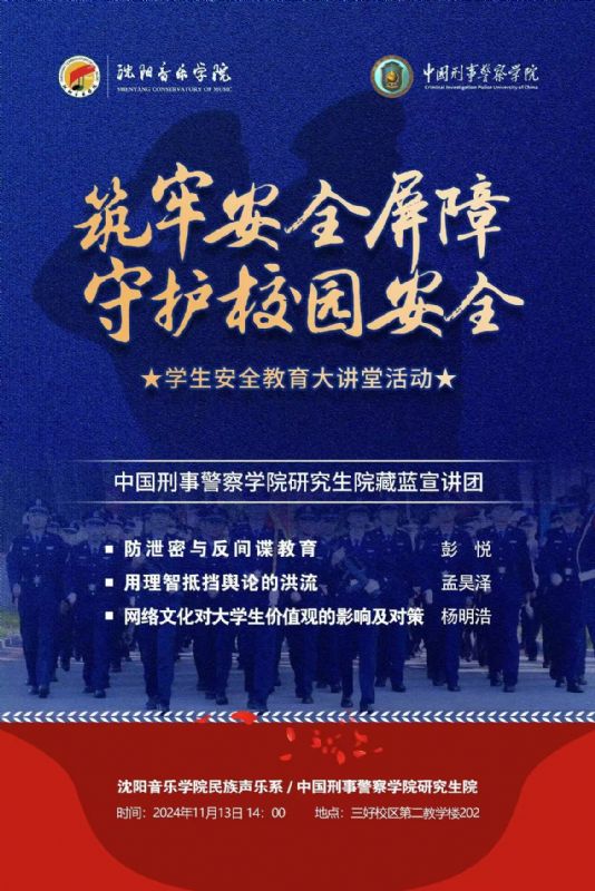 民族声乐系特邀中国刑事警察学院研究生院藏蓝宣讲团到我系开展《筑牢安全屏障,守护校园安全》学生安全教育大讲堂