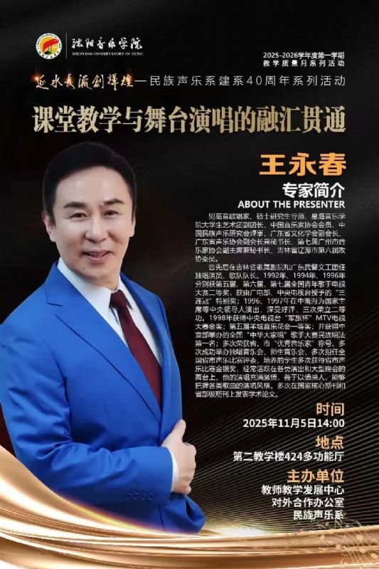 预告!延水长流创辉煌——民族声乐系建系40周年系列活动 | 王永春教授《课堂教学与舞台演唱的融汇贯通》讲座