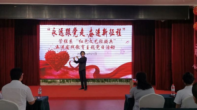 活动中,我系文艺轻骑兵积极参与到“永远跟党走 奋进新征程”的志愿服务演出中,2021级学生陈子阳以单簧管独奏《苏北调变奏曲》开场,赢得观众阵阵掌声;2020级学生孙路翔演奏的《梁祝》旋律凄美婉转、荡气回肠,观众很快被带入情境;2021级学生代京辰、陈子阳合奏的《一步之遥》热情奔放,展现了当代大学生积极向上的精神面貌;2020级学生韩佳君、孙路翔合奏的《月亮代表我的心》《亲爱的旅人》、2021级学生李金泽独奏的《听海》《回家》等节目接连上阵,精彩纷呈,最后,2021级学生冉宇杰、石现表演的《我的祖国》将演出推向高潮,乐曲嘹亮,气势恢宏,赢得观众一次又一次热烈的掌声。