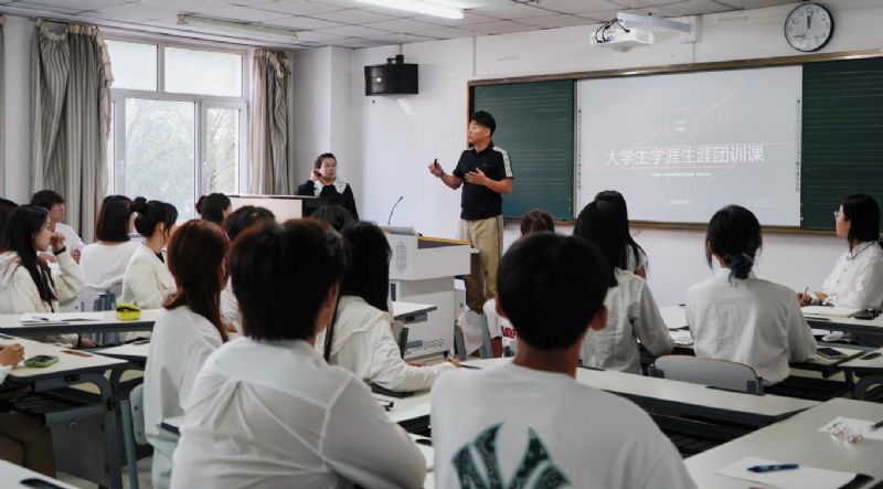 任士明首先为与会2024级新同学带来一堂精彩的大学生学涯生涯团训课。活动现场,他为同学们作了“六边形”人格测试,讲解了学涯规划五步法,并通过趣味游戏等方式,让同学们进一步增强自我认知能力,提升自我效能感,同时也使同学们对个人职业生涯规划有了初步了解和认识,帮助同学们打开职业生涯规划之门,引导2024级新生树立正确的人生观、就业观和择业观。