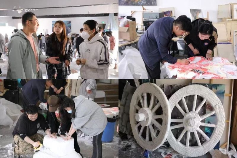 戏剧影视美术设计系结合专业特点开展“泡雕模型制作”活动。教师现场拆解切割、塑形、打磨等核心泡雕技巧,从简单几何形体到复杂道具造型,为同学们传授技艺。同学们分工协作,在场景设计绘图、泡沫雕刻组装、色彩搭配等环节默契配合,通过精心雕琢,创作出历史车轮、石井、滩石等饱含戏剧元素的作品,成功将课堂知识转化为真实创作,同时借助泡沫特质打破常规,实现独特视觉效果,展现了专业实力与创新思维。