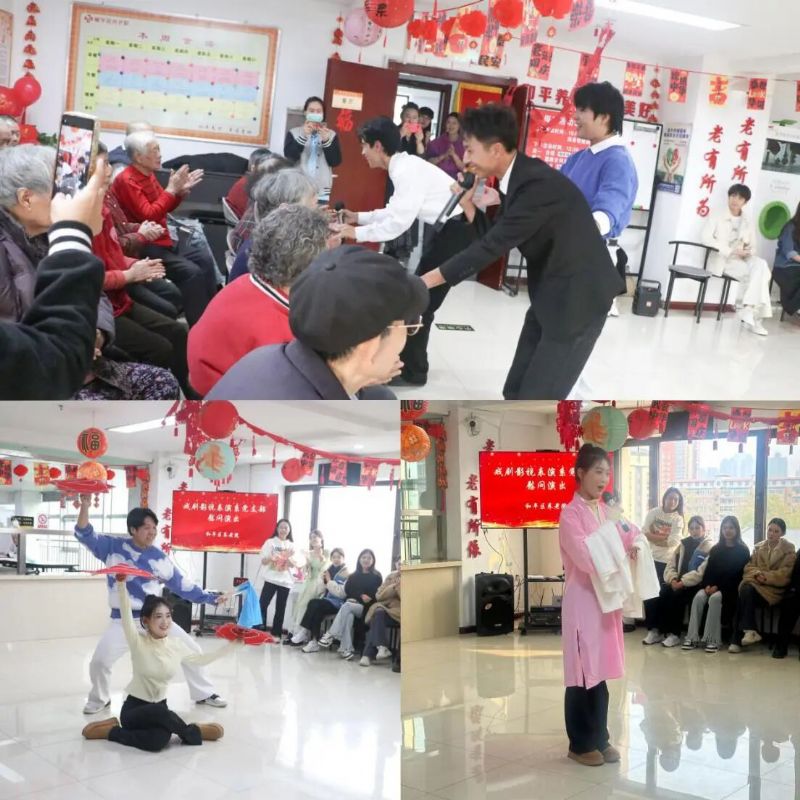 活动中,师生们立足专业所长,带来经典戏曲选段、耳熟能详的红色歌曲演唱等特色节目。欢乐温情的演绎让老人们的脸上绽放出灿烂笑容,阵阵热烈掌声为现场增添了浓厚的互动氛围。令人动容的是,老人们也主动献上两个精心准备的节目,字里行间的真挚情感与历经岁月沉淀的从容风采,深深打动了在场每一个人。当师生与老人们携手完成表演时,不少学生热泪盈眶,心灵受到深刻触动,真切体悟到岁月沉淀的生命厚度与向阳而生的生活热忱。表演之余,大家围坐促膝长谈,倾听老人们的人生故事;细致整理房间,打理生活琐碎,以点滴行动传递陪伴的温暖,让志愿服务不仅成为专业实践的延伸,更化作传承尊老敬老美德、厚植家国情怀的生动课堂。